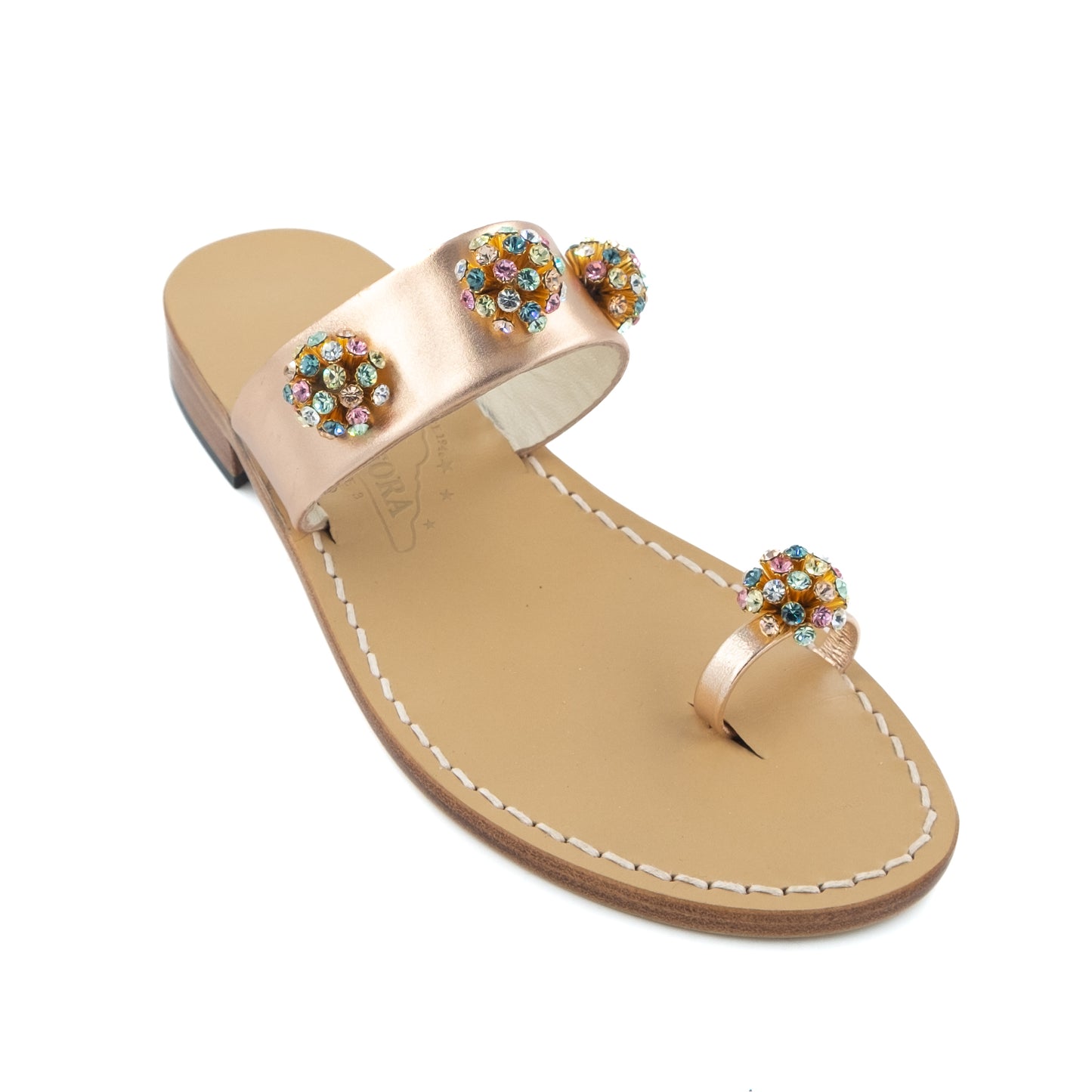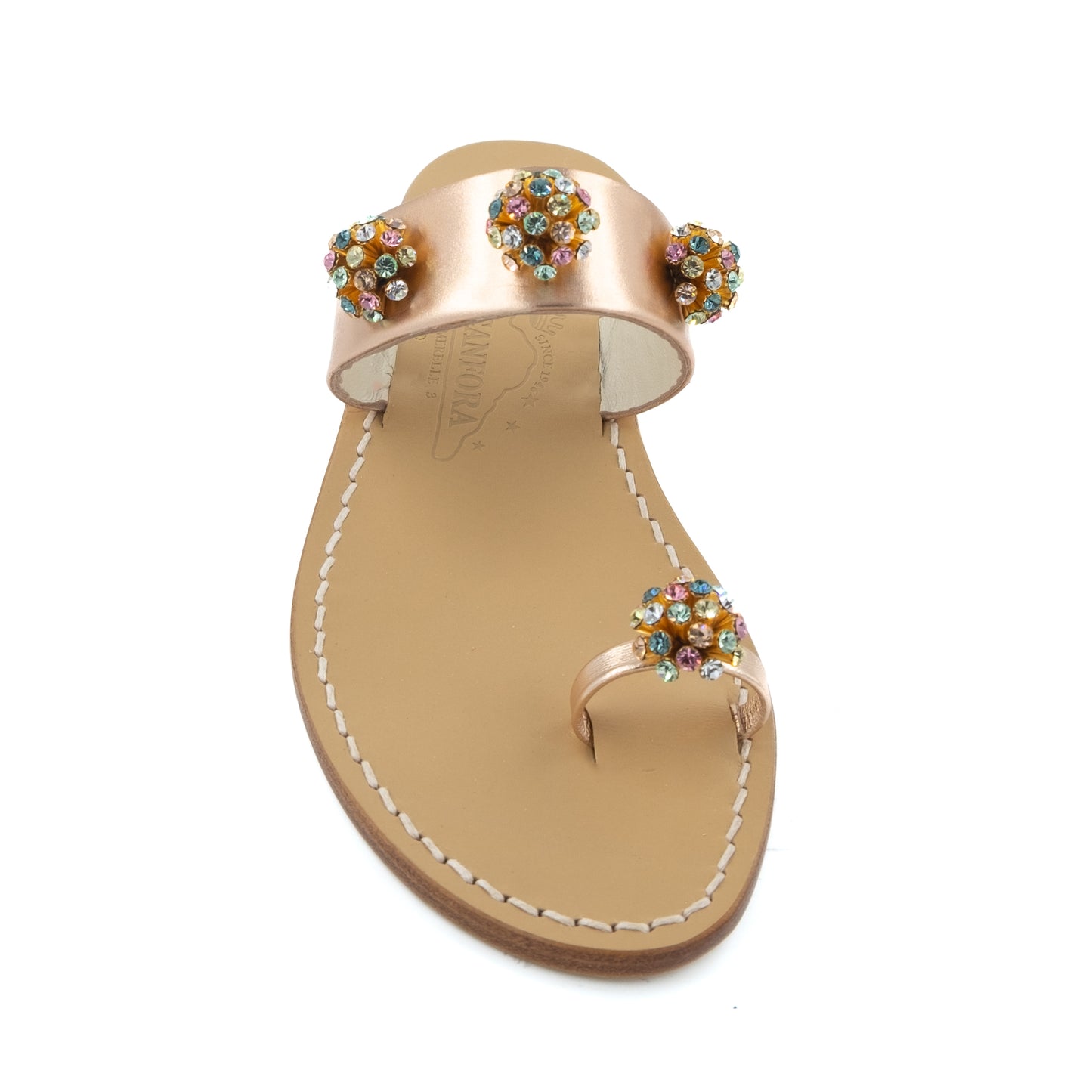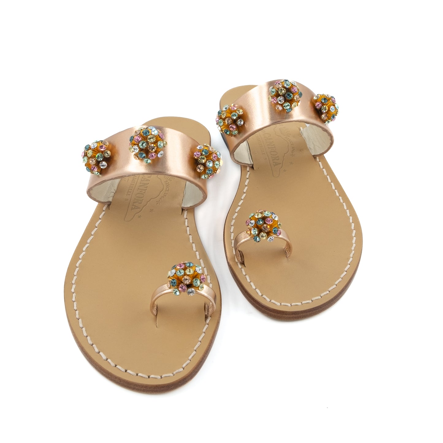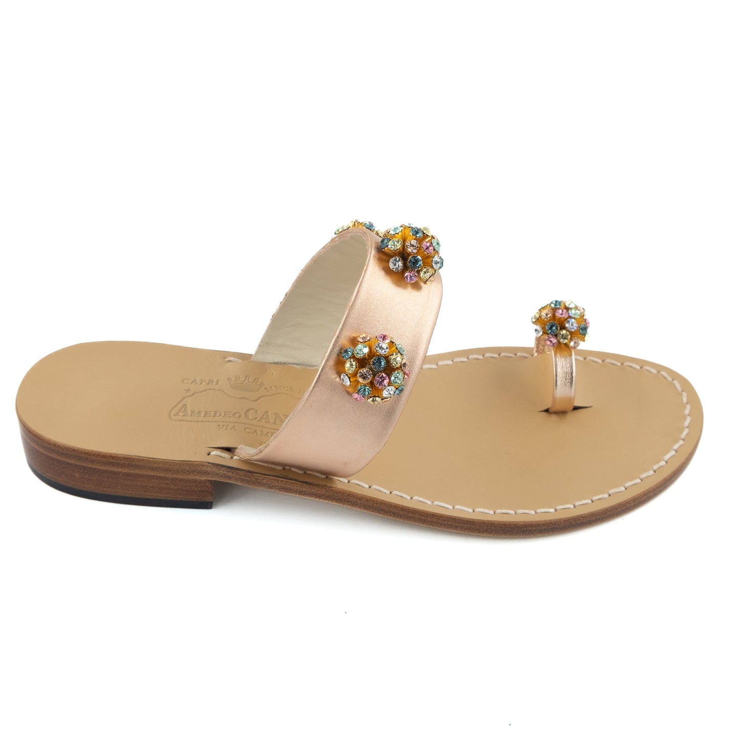 The Iris sandals by Canfora Capri blend a stunning rose gold strap with dazzling Swarovski crystals for a truly sophisticated look. Designed for comfort without compromising elegance, these sandals elevate any outfit with their timeless charm. Crafted with expertise since 1946, Iris represents the pinnacle of refined style and quality footwear.